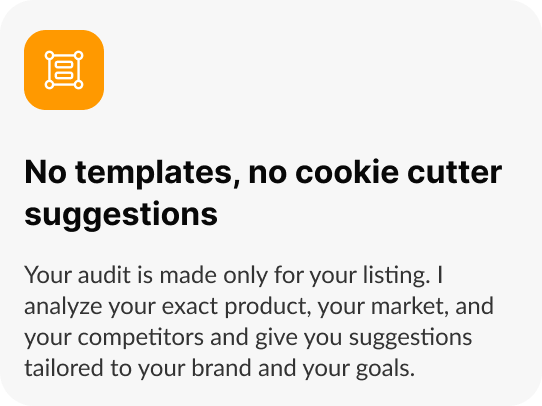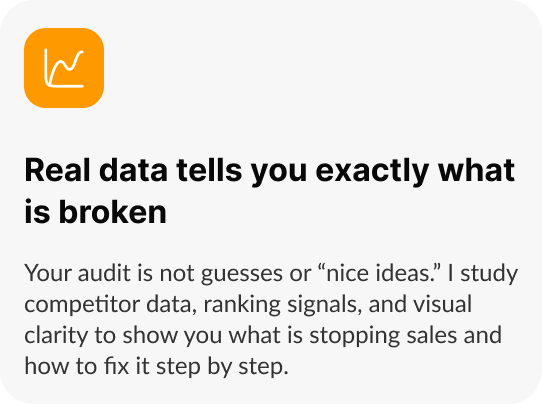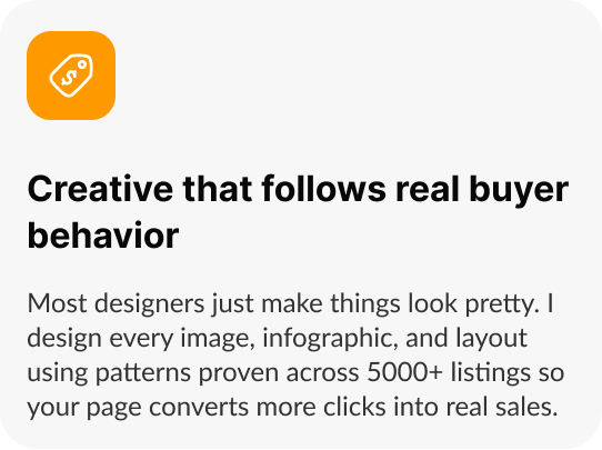 I use real buyer-behavior data and thousands of proven, high-converting design patterns to show you exactly what your listing needs to convert better. Instead of guessing, you’ll see what your customers actually look for, what makes them trust a product, and what pushes them to buy. This way, every change you make is based on what truly works, not trial and error.