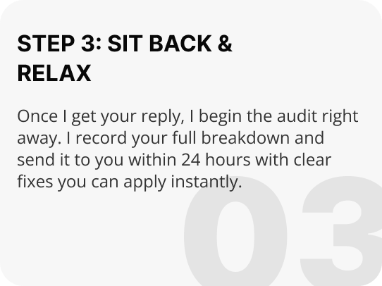 My goal has always been simple: I want you to make more money with the traffic you already have. Every audit I deliver is honest, detailed, and easy to understand. I break down exactly what’s hurting your conversions, why it’s happening, and what you can fix immediately to see better results.